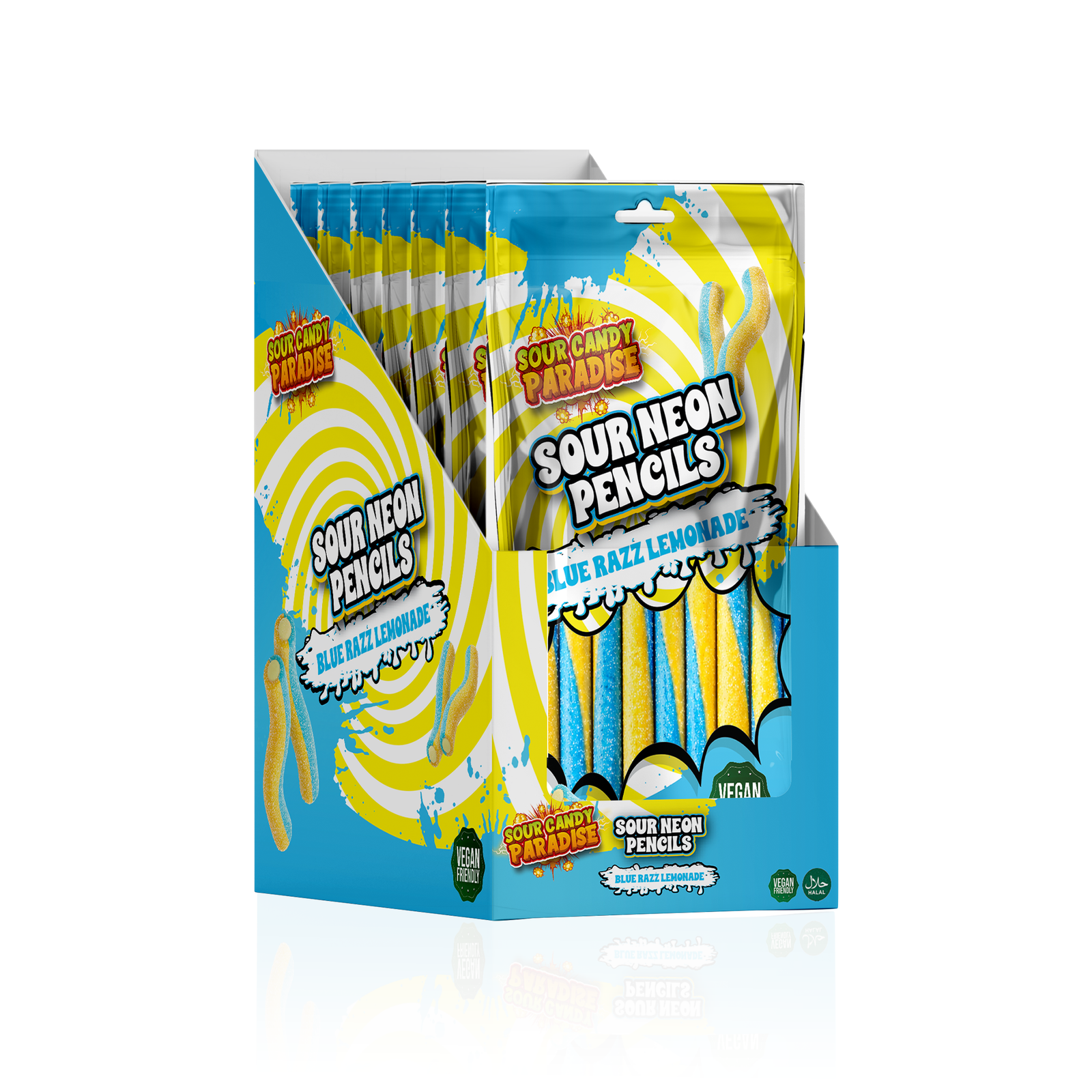 (IT) Matite gommose acide gusto frutta. Ingredienti: Zucchero, sciroppo di glucosio, farina di frumento, amido di mais, acidi (acido citrico, acido malico), concentrato di succo di mela, olio di palma, aroma, emulsionante (mono- e digliceridi degli acidi grassi), coloranti (E102, E133). Per gli allergeni, consultare gli ingredienti in grassetto. Avvertenza: E102 possono avere un effetto negativo sull’attività e l’attenzione nei bambini. Conservare in un luogo fresco e asciutto. Evitare la luce solare diretta. Prodotto in Türkiye.